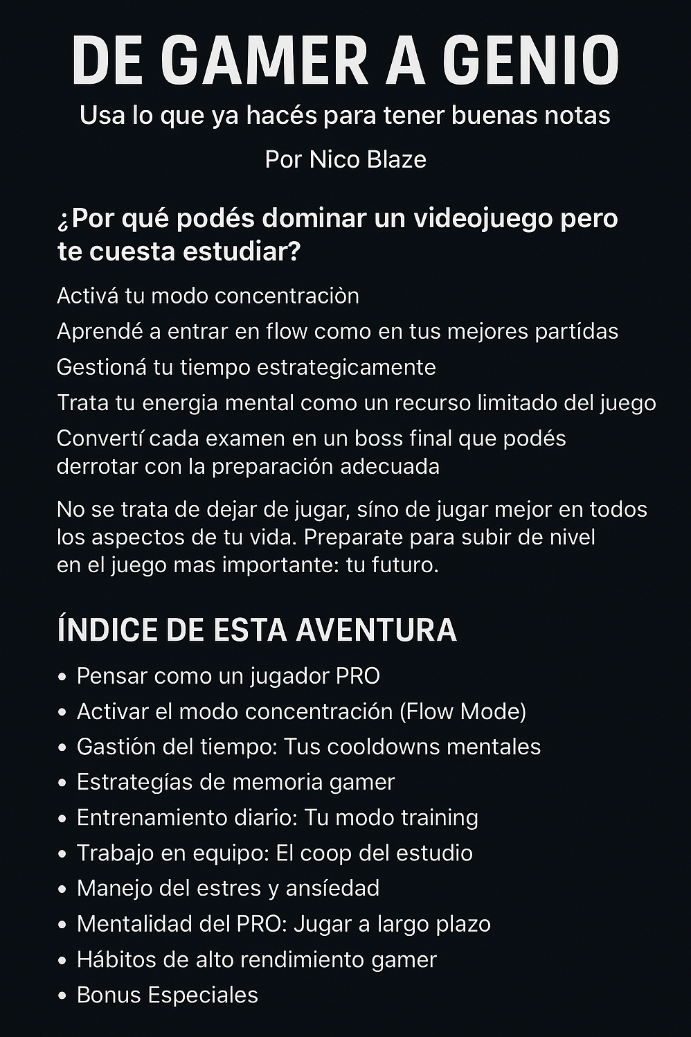 Es un ebook que te enseña a usar tu mentalidad gamer para estudiar mejor, concentrarte más y obtener mejores resultados sin dejar de jugar.