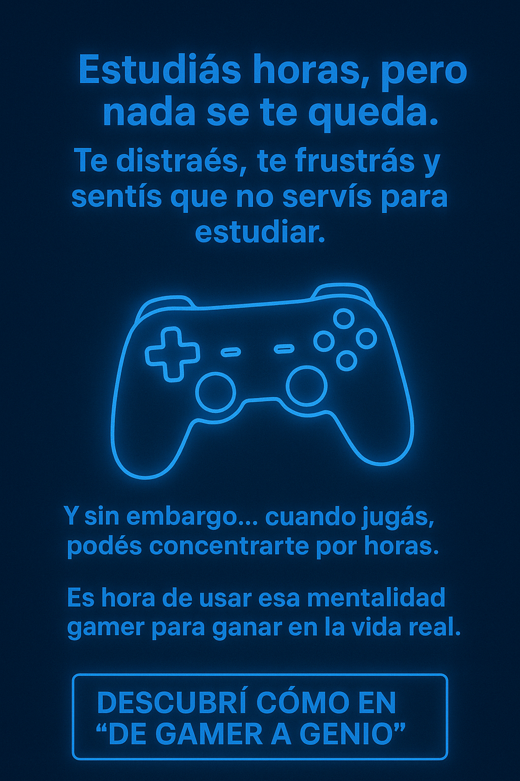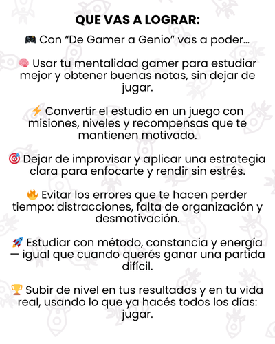 Es un ebook que te enseña a usar tu mentalidad gamer para estudiar mejor, concentrarte más y obtener mejores resultados sin dejar de jugar.